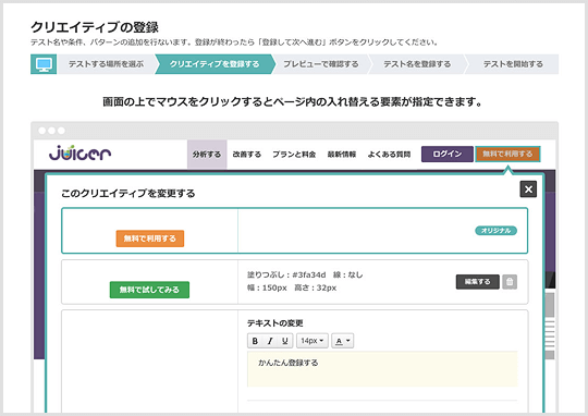 LOGLY Audience Analyticsでは、A/Bテストを実施するページの指定、クリエイティブの登録、成果指標や条件の設定まで、すべての手順を簡単なクリック操作のみで行うことができます。クリエイティブの登録時も、画像ならドラッグ&ドロップ、ボタンなら⾊や⼤きさを画面上から選ぶだけなので、エンジニアの方でなくてもソースコードに触れることなくテスト実施が可能です。