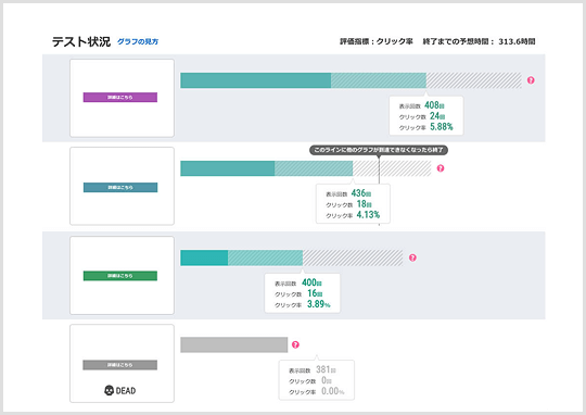 LOGLY Audience AnalyticsのA/Bテスト機能では、1位になれないと統計的に判断されたパターンを⾃動で⾮表⽰にする「サバイバルモード」を搭載しています。クリック率、コンバージョン率などの成果がより⾼いパターンだけが⽣き残り、より多く表示されるようになるため、A/Bテストを続けながらサイトを最適化してゆくことができます。