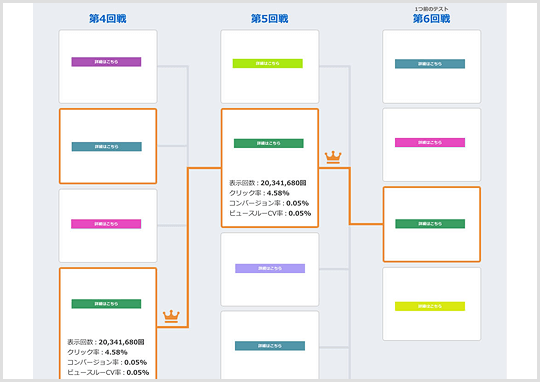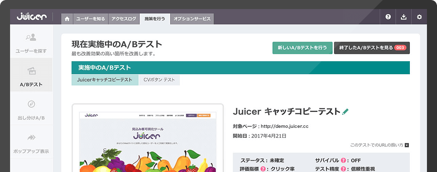 過去のA/Bテストで最も成果を出した勝利パターンを引き継いで、「過去の勝利パターンvs新しいクリエイティブ」というA/Bテストも作成できます。A/Bテストが終わるたびにソースコード触って勝利パターンのクリエイティブに差し替える、という作業が必要ないので、サイト改善のPDCAをスムーズに回すことができます。