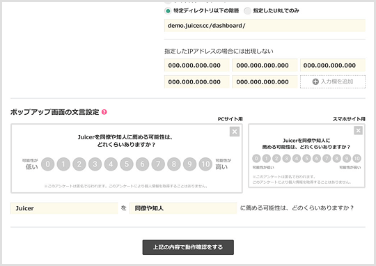 特定のIPアドレスからのアクセスの場合、NPS回答フォームを表示させないように設定することもできます。社内アクセスの場合は表示させないように設定していただくと、ノイズを省くことができます。