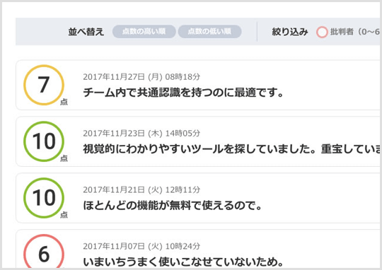LOGLY Audience AnalyticsのNPS機能では、「〇〇を友人や同僚に薦める可能性は、どのくらいありますか?」という質問にスコアを付けた後、ユーザーにそのスコアを付けた理由を任意で入力してもらうことができます。このコメントもLOGLY Audience Analytics内に蓄積され、スコアと一緒に一覧で確認することができます。スコアによる定量的な分析だけではなく、「なぜそのスコアを付けたのか」「顧客は何を望んでいるのか」といったインサイトを定性的なコメントから分析することで、Webサイト改善のヒントが得られます。